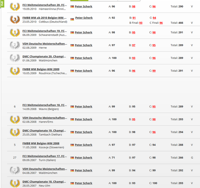 Bendix vom Adlerauge (tra parentesi figlio di Da'Eder per una figlia di Gismo, esattamente come i velvettini lettera F) - IPO3 - campione del mondo FCI 2009-2010 - campione del mondo FMBB 2009. Vale la pena vedere l'elenco dei punteggi e dei titoli perchè una costanza così di rendimento è quasi impossibile da raggiungere