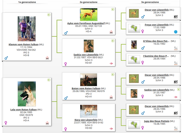 Una femmina di malinois molto forte, spesso eccellente nelle tre fasi alle più importanti manifestazioni internazionali e nazionali, due volte classificata 4° ai mondiali di ipo, presenta nel suo pedigree più volte Oscar e una volta Saskia, richiamando così il pedigree di Klemm.
