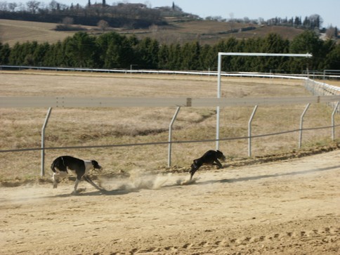 Le qualità sportive di Dennis sono numerose. E’ infatti un cane estremamente reattivo, con una partenza velocissima, tantissimo ardore, una frequenza di battuta allucinante. E’ un po’ piccolo per i giganti che si vedono nei cinodromi e nei coursing, al limite della taglia e sempre più spesso molto oltre. Ma la sua qualità maggiore che si può vedere anche in campagna mentre corre libero da solo o con altri cani è la capacità di girare alla massima velocità in un fazzoletto. Giuro che non ho mai visto questa capacità in altri whippet o levrieri a questo livello. Queste qualità hanno reso Dennis un cane praticamente quasi imbattibile in coursing. Oltretutto mentre tanti whippet suoi concorrenti sono stati sempre curati o curatissimi nell’alimentazione (con integratori, ecc.) e soprattutto nell’allenamento, lui è un whippet fatto un casa. Per tanti motivi tra cui la malattia di Summer, la gare di obedience, agility, ipo degli altri cani, l’addestramento al club, ecc. Dennis ha sempre corso con alle spalle solo passeggiate in campagna e palline nel campo, senza un programma specifico.