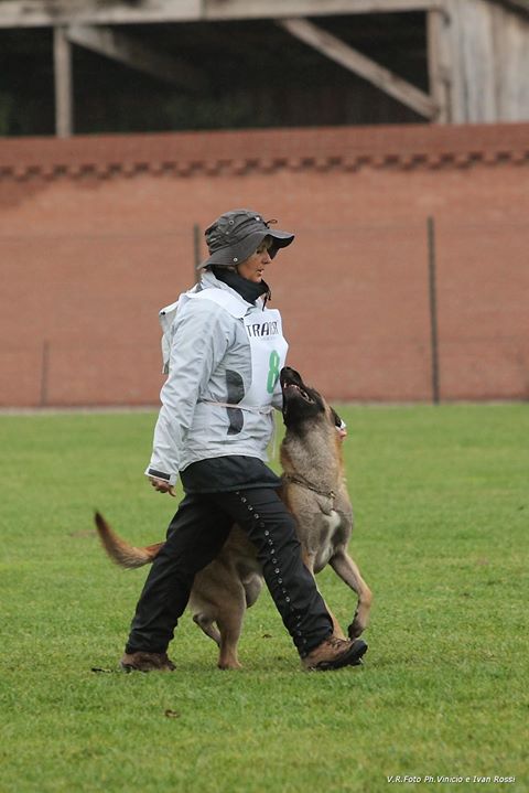 Ha fatto un po' di tutti gli sport (agility, sheepdog, ipo, obedience), ultimamente Manuela ha trovato gli istruttori che potevano seguirla restando nel suo-nostro concetto etico metodologico di lavoro e cominciano a vedersi i risultati.