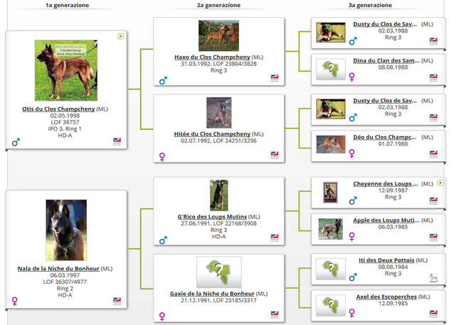 Nala è sua volta figlia del riproduttore francese G'Rico des loups mutins, a sua volta figlio di Cheyenne des loups mutins per una figlia di Robin. G'Rico è uno dei riproduttori che è tutt'ora presente in tantissimi finalisti di ring francese perchè assicura morsi ed entrate strepitose.