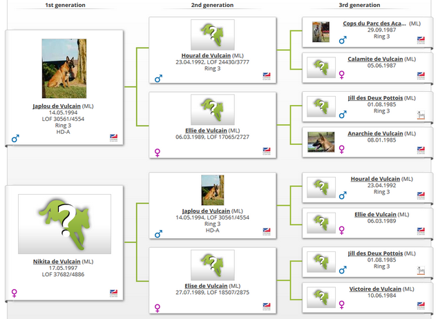 Tex ha nel pedigree in consanguinità Japlou de Vulcain, un cane che ha più volte G'Bibber e Othar de la noaillerie e allo stesso tempo Cops du parc des acacias, che ha di nuovo Cartouche e Espoir..